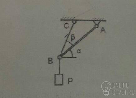 Груз весом Р=10 Н подвешен к концу стержня АВ , который удерживается под углом α=15° к горизонту при помощи троса ВС . Угол между тросом и стержнем равен β=30° .
