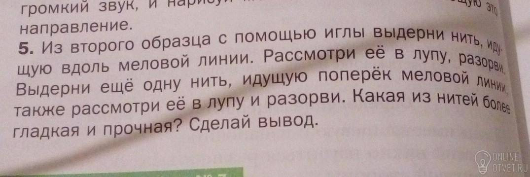 Тебе нужно взять материал любой и иглой вытащить от туда долевую нить и поперечную ( можно этого не делать просто написать вывод)