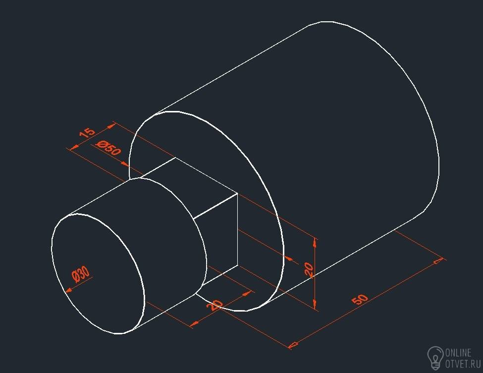 Пожалуйста, помогите с черчением! Если можно то эскиз, или хотябы объясните как это будет выглядеть. Эскиз: деталь (вал) состоит из двух соосных цилиндров. К центру основания большего цилиндра примыкает квадратная призма. Размеры меньшего цилиндра:основание диаметр 30 мм, высота 20 мм Размер большего цилиндра: основание диаметр 50 мм, высота 50 мм. Размер призмы:основание 20*20 мм, высота 15 мм.