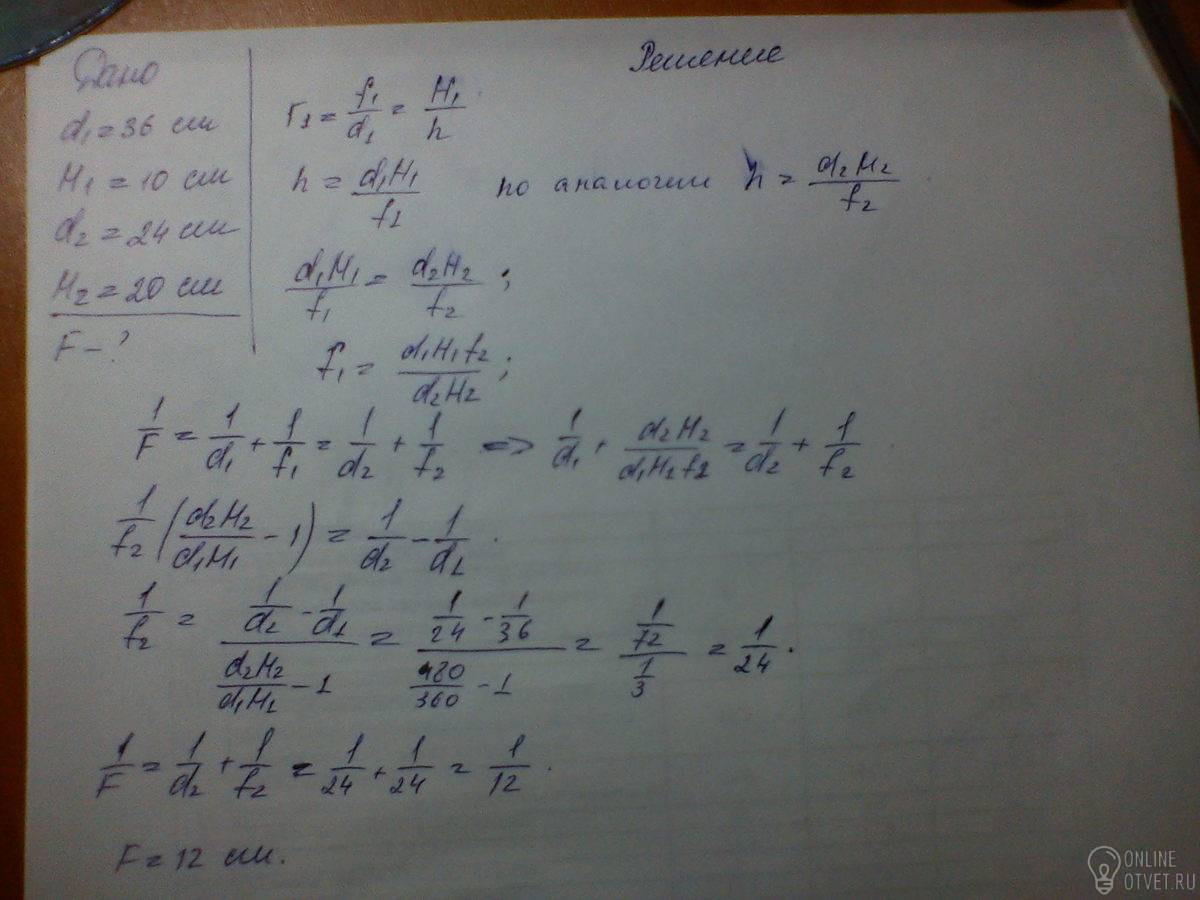 Если расстояние предмета от линзы 36см, то высота изображения 10см. Если же расстояние предмета от линзы 24см, то высота изображения 20см. Найдите фокусное расстояние линзы.