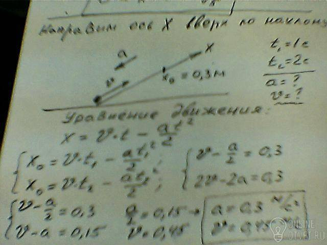 по наклонной доске пустили снизу вверх шарик. на растоянии 30 см от начала пути шарик побывал дважды: через 1 с и 2 с после начала движения. определите начальную скорость и ускорение шарика, считая движение равноускоренным
