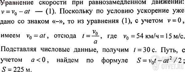Потяг рухається рівносповільнено маючи початкову швидкість 54 км\год, і прискорення -0.5 м\с. Через який час і на якій відстані від початку гальмування потяг зупиниться?