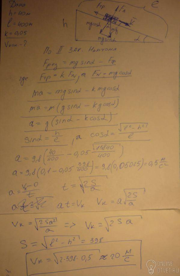 Вагон спускается с сортировочной горки без начальной скорости. Высота сортировочной горки 40 м, длина спуска 400 м. Коэффициент трения колёс вагона о рельсы составляет 0,05. Определите скорость,которую приобретает вагон в конце сортировочной горки.