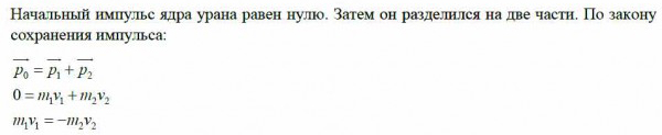 Ядро урана при захвате нейтрона разделяется примерно на две равные части, которые называются осколками деления, при этом осколки разлетаются в противоположные стороны. Это можно объяснить на основе закона сохранения импульса. Импульс ядра урана до захвата нейрона практически равен нулю. При захвате нейрона ядро, получая от него некоторый импульс, раскалывается на две разлетающихся части массами m1 и m2. Если записать закон сохранения импульса: