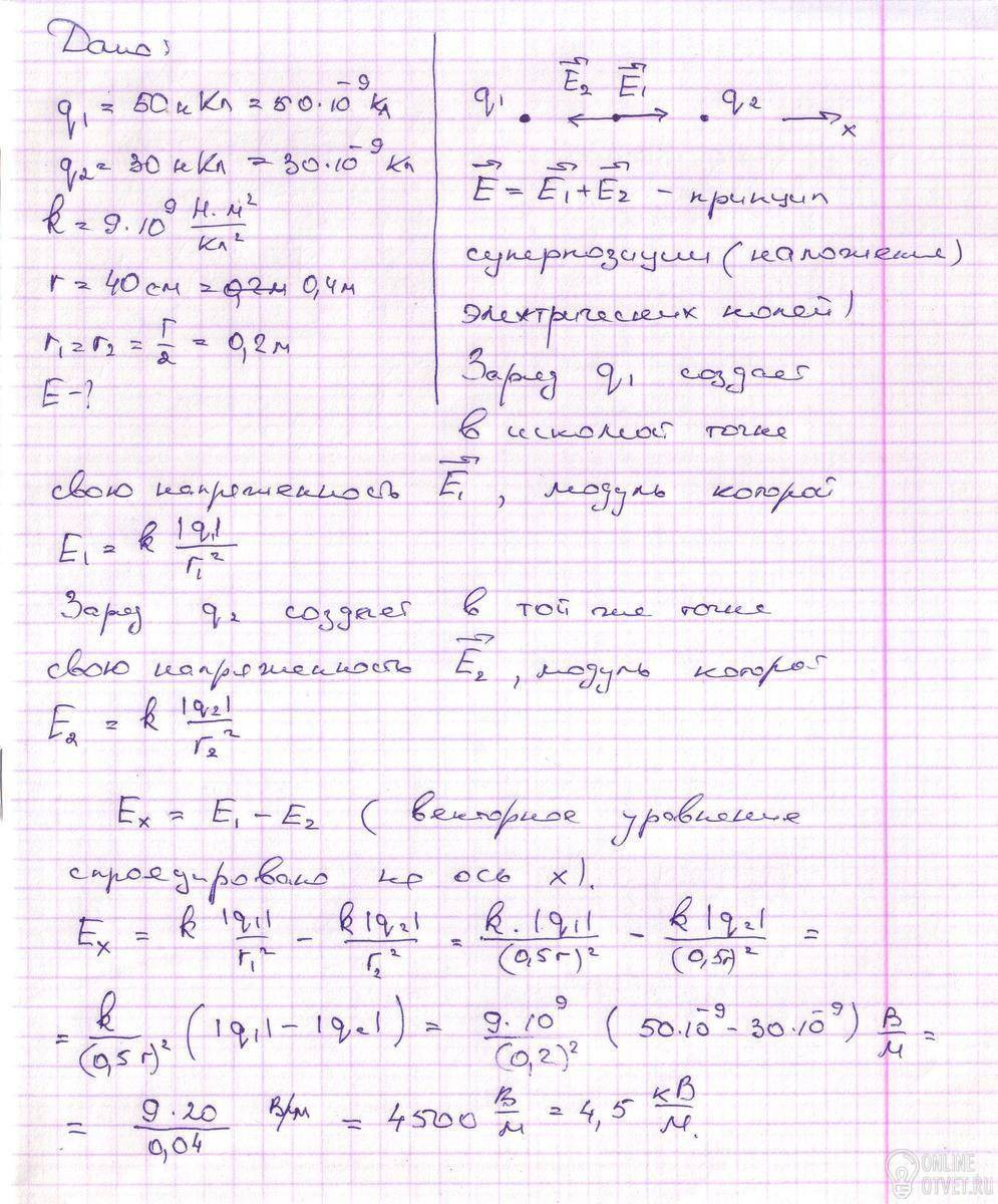 Между двумя зарядами 50нКл (50*10^-6) и 30нКл (30*10^-6) в вакууме расстояние 40 см. Определить в СИ напряженность электрического поля посередине между зарядами.