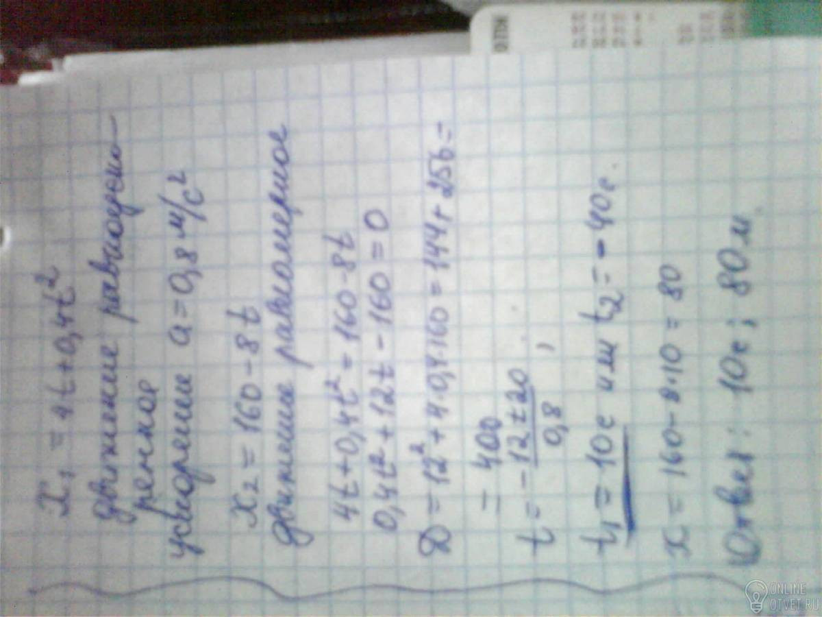 Движение двух велосипедистов заданы уравнениями: х1=4t+0,4t2(м) и х2=160-8t(м). Как двигались велосипедисты? Найти время и место встречи.