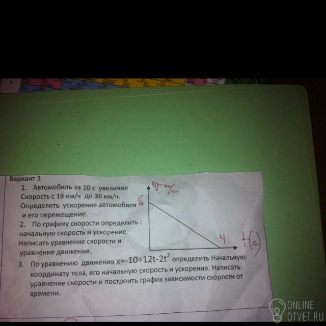 3. По уравнению движения x= -10 +12t -2(t)^2 определить начальную координату тела, его начальную скорость и ускорение. Написать уравнение скорости и построить график зависимости скорости от времени.
