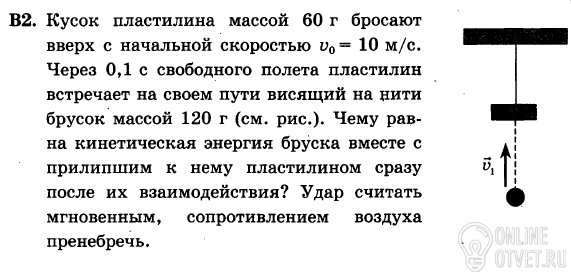 Кусок пластилина массой 60 г бросают вверх с начальной скоростью v0=10 м/с. Через 0,1 с свободного полета пластилин встречает на своем пути висящий на нити брусок массой 120 г. Чему равна кинетическая энергия бруска вместе с прилипшим к нему пластилином сразу после их взаимодействия? Удар считать мгновенным, сопротивлением воздуха пренебречь.