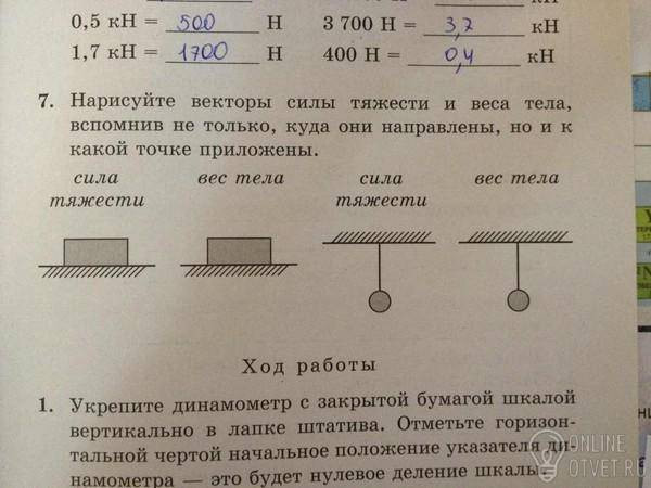 Ну сила тяжести направлена вниз из центра прямоугольника и из центра шара, а вот вес тела -- это вообще не векторная величина, а скалярная так, что никаких векторов не может и быть:))