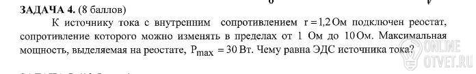 Мощность отдаваемая источником тока в сеть Так как для источника тока , напряжение и мощность, выделяемая им, неограниченно растут при росте сопротивления значит максимальная мощность будет при максимальном сопротивлении, находим ток I( в квадрате ) = P/R=30/10=3А - корень из 3А, I=1.73 А находим эдс e =I* (R+r )=1.73*(10+1.2)=19.38 В