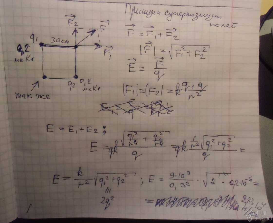 В двух противоположных вершинах квадрата со стороной 30 см расположены заряды по 0,2 мкКл каждый. Определить напряженность поля в двух других вершинах квадрата.