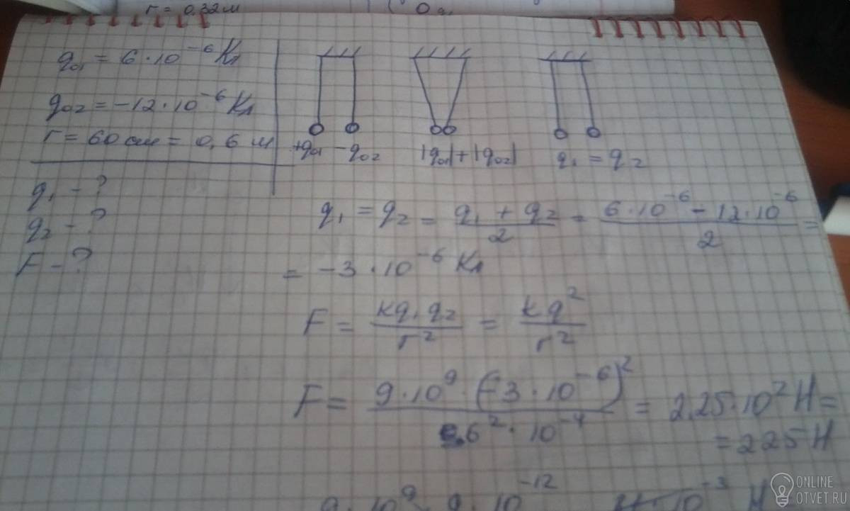 Два заряда 6 мКл и -12 мКл на расстоянии 60 см друг от друга. Определить силу взаимодействия и заряды после взаимодействия.