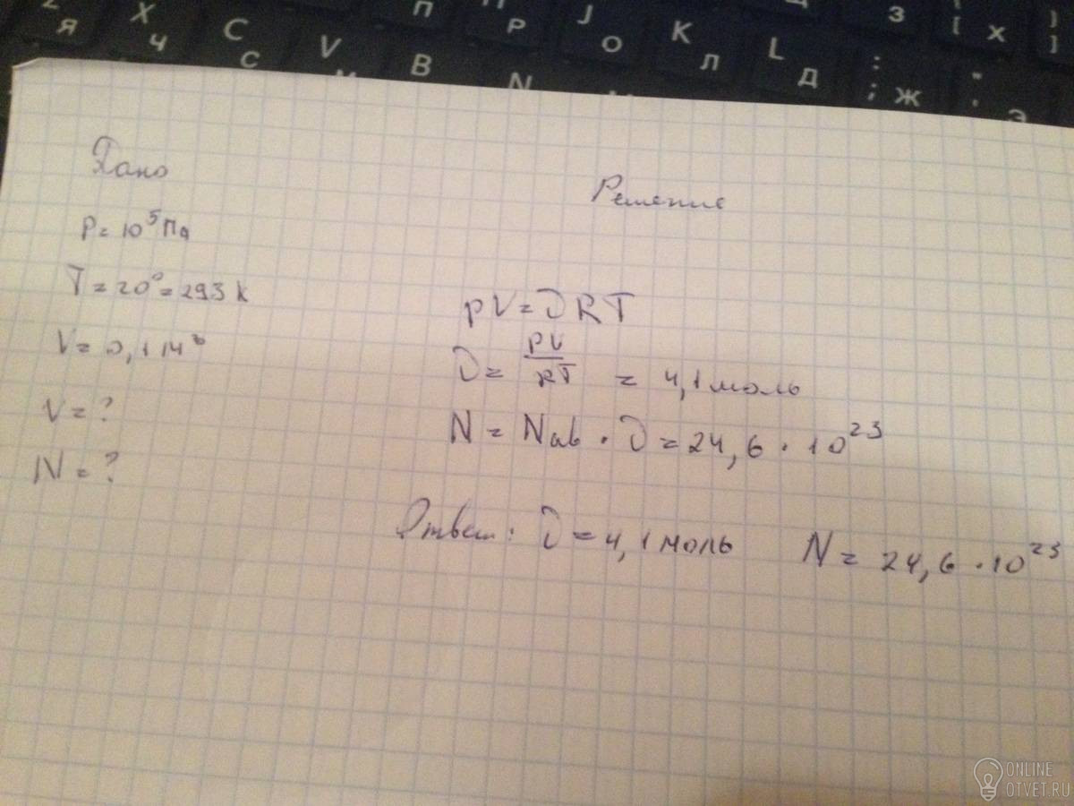 Газ занимает объем 100л при нормальном атмосферном давлении и комнатной температуре 20С. Каково кол-во вещества газа? Сколько молекул газа в этом сосуде?