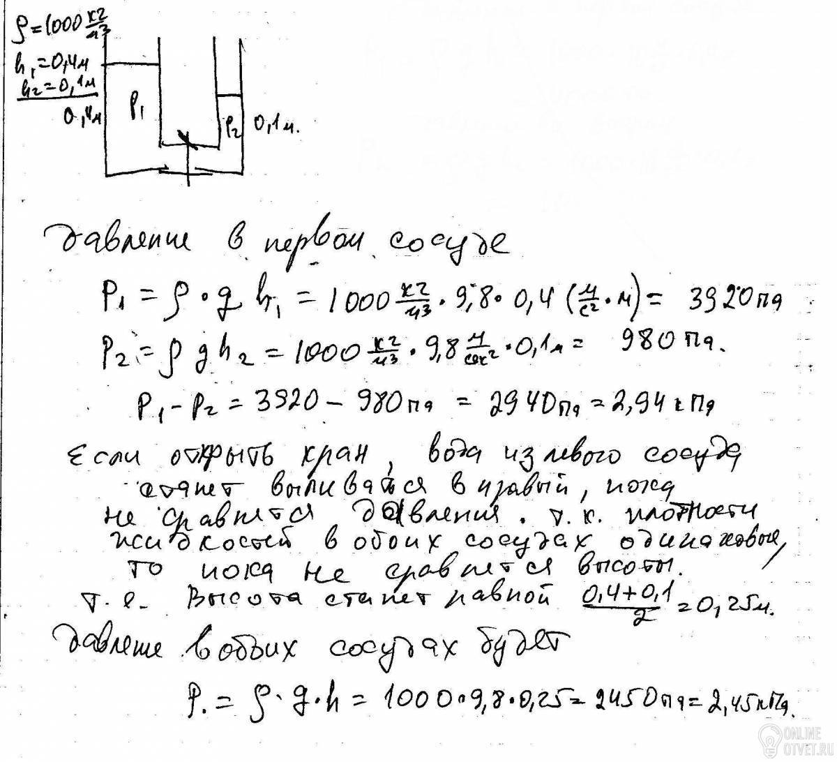 В два сосуда налита вода . В каком сосуде давление воды на дно больше и на сколько , если h1=40 см, а h2=10 см? В каком направлении и до каких пор будет передвигаться вода, если открыть кран ? ( ответ: в левом сосуде на 2,94 кПа)