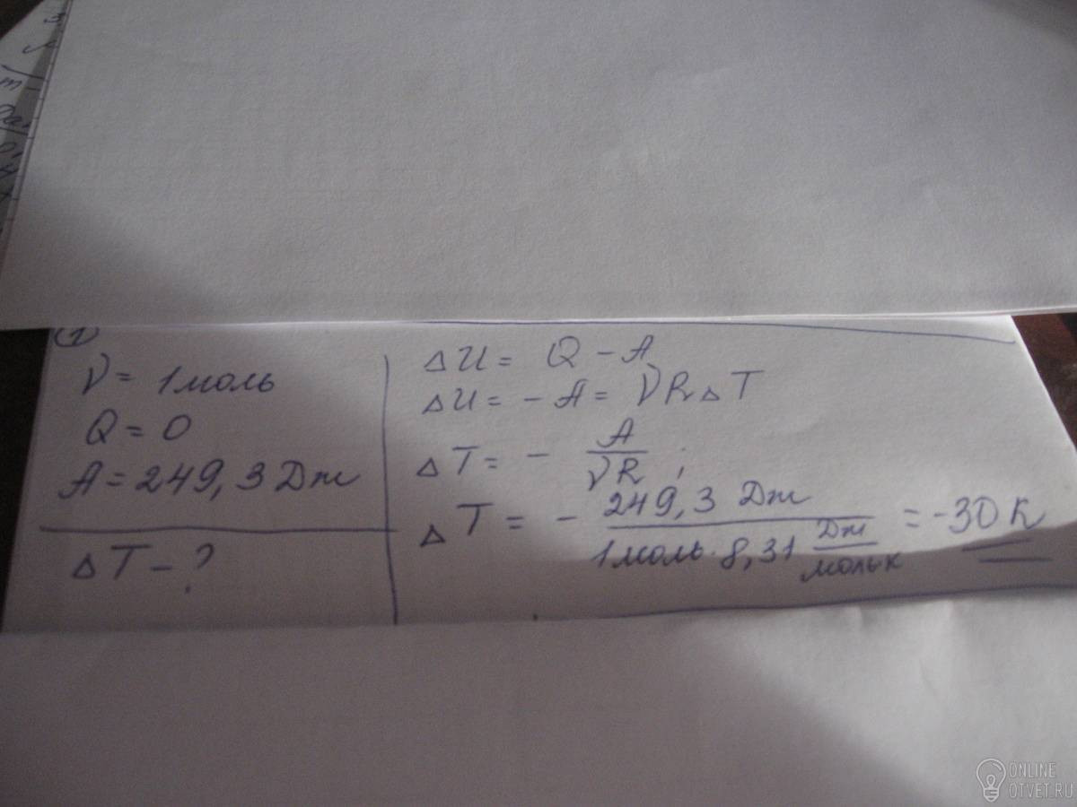 1,Насколько уменьшится температура (в К) 1моля одноатомного идеального газа, совершившего в адиабатном процессе работу 249,3Дж (универсальная газовая постоянная равна 8,31Дж/мольК).