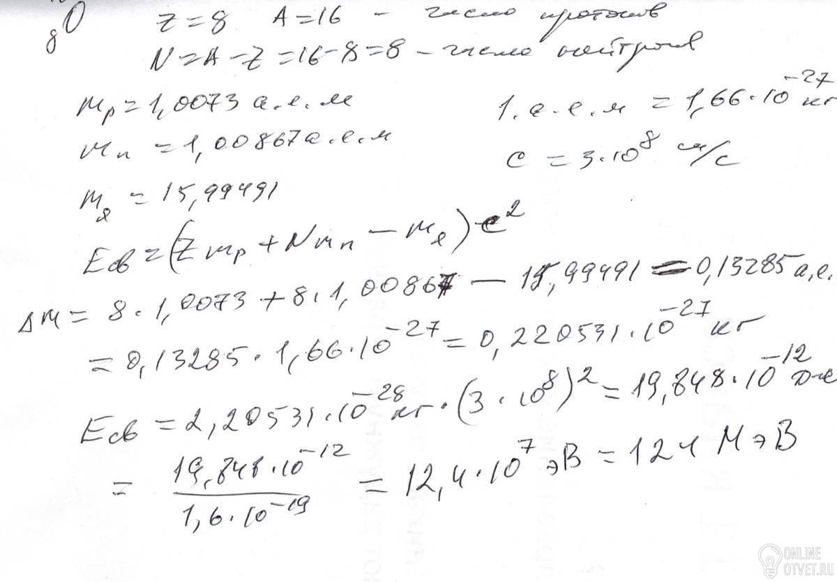 Рассчитайте энергию связи ядра изотопа кислорода масса протона 1,0073 масса изотопа кислорода 15,99491