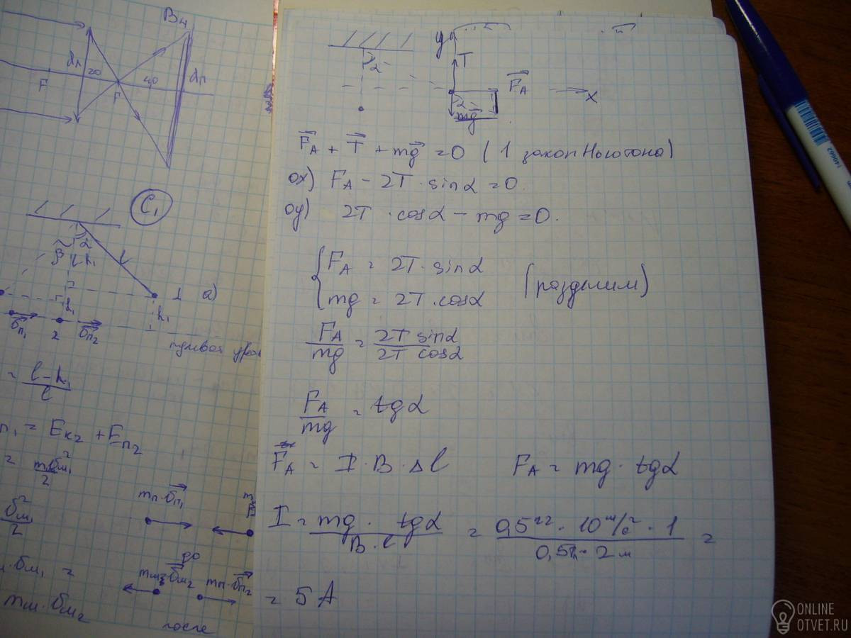 На двух нитях висит горизонтально расположенный стержень длиной 2 м и массой 0.5 кг. Стержень находиться в однородном магнитном поле, индукция которого 0.5 Тл и направлена вниз. Какой ток нужно пропустить по стрежню, чтобы нити отклонились от вертикали на 45градусов?