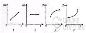 5) По 2 рисунку. Изображены графики зависимости магнитного потока, пронизывающего контур, от времени. Укажите случай, когда ЭДС индукции возрастает:
