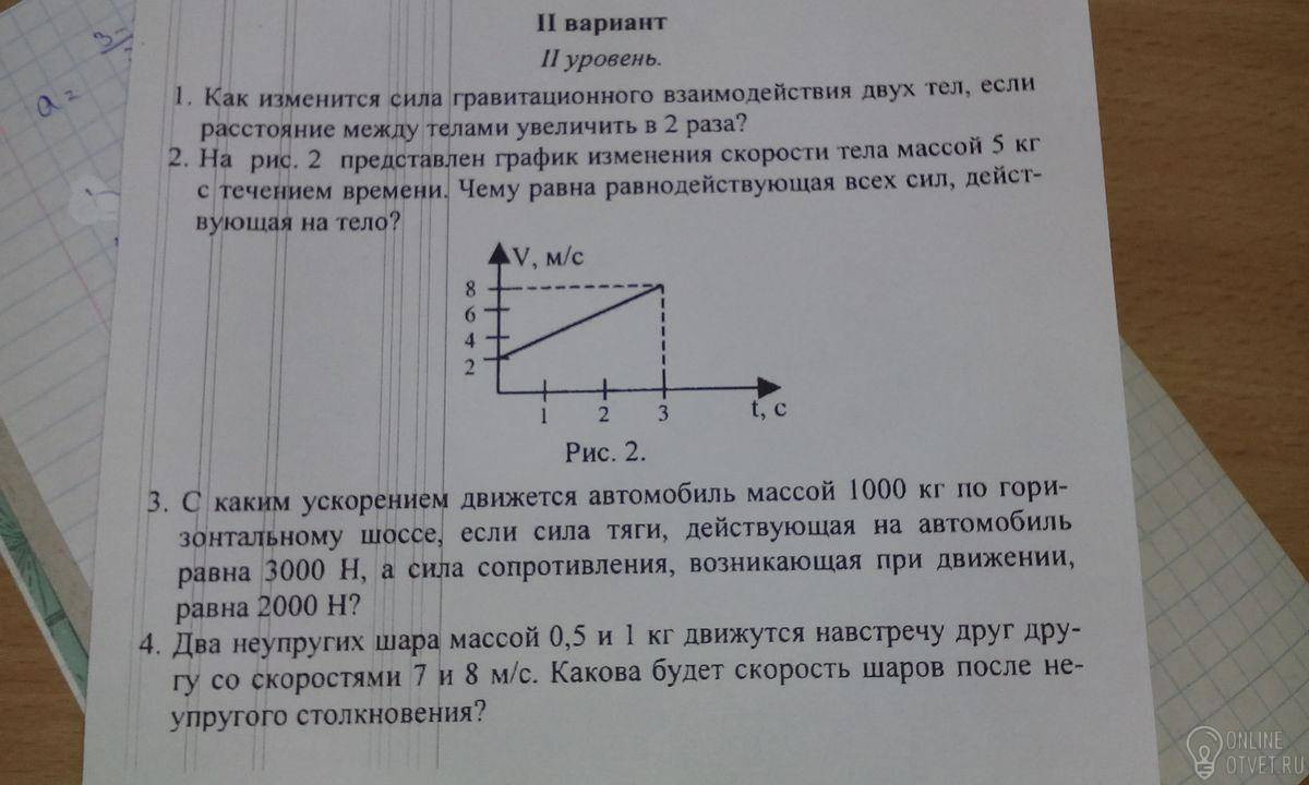 номер 2, а=(Vконечная-Vначальная)/t, тогда выходит что а=(8-2)/3, а=2, если нам известно что масса тела равно 5 кг, мы берем формулу F=ma, F=5*2,F=10