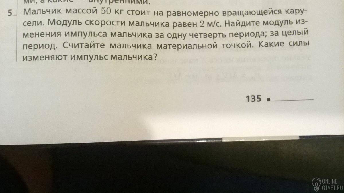 Импульс мальчика изменяют, строго говоря, силы трения покоя, благодаря которым осуществляется сцепление с вращающейся опорой. Под их воздействием прямолинейное равномерное движение, которое мальчик осуществлял бы в их отсутствии, он испытывает центростремительное ускорение, постоянно изменяющее направление движения мальчика - а следовательно, и вектор его импульса.