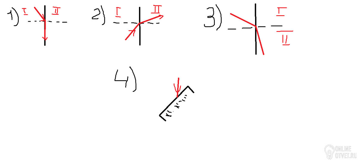 Следовательно, на рис.1) первая среда оптически более плотная, чем вторая. На рис.2) оптически более плотная вторая среда. На рис.3), вероятно, ошибка. Если взять за основу расположение сред, то пунктирная линия должна быть сплошной, а сплошная должна быть пунктирной. Тогда Ваш рисунок будет идентичен рис.1 во вложении, и более плотной будет вторая среда. Если же перепутано положение сред, то примем, что слева среда 1, а справа среда 2. Тогда среда первая будет более плотной. Решение рис.4) смотрите во вложении, рис.2.