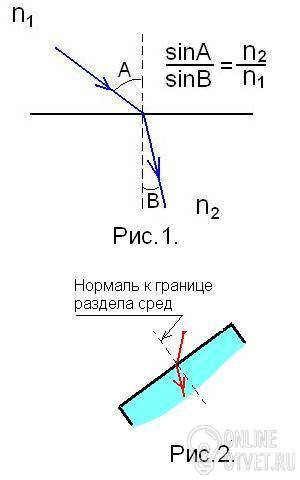 Закон преломления гласит: отношение синуса угла падения к синусу угла преломления есть величина постоянная для двух сред и равна отношению коэффициента преломления среды, в которую вошел свет к коэффициенту преломления среды, из которой вошел. Смотрите рисунок 1 во вложении.