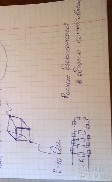 Расчет общего сопротивления бесконечной цепи R общ=R+- Rv3=2,7*R, если R=10 Ом, то Rобщ=27 Ом, решение с минусом можно опустить Т.к. вычитаемое больше уменьшаемого, что не имеет смысла.