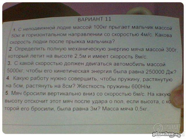 5. В момент бросания мяч обладал энергией равной Еполн.= Екинет + Е потенц = m(V²/2 + gh). После отскока на максимальной высоте подъема кинетическая энергия мяча равна нулю, т.к. в высшей точке его скорость равна нулю. Следовательно, мяч будет иметь лишь потенциальную энергию Еп = mgH. Поскольку в задаче ни чего не говорится об упругости удара мяча о пол, и о сопротивлении воздуха, будем считать, что сопротивление воздуха отсутствует, и что удар абсолютно упругий. В этом случае вся энергия, которую имел мяч в момент бросания перейдет в потенциальную энергию на максимальной высоте подскока. Тогда запишем уравнение: m(V²/2+ gh) = mgH. Или (V²/2+ gh) = gH. Отсюда H = (V²/2+ gh)/g = (6²/2 + 10*3)/10 = 4,8 м.