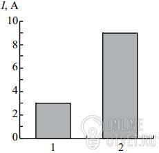 На рисунке приведена столбчатая диаграмма. На ней представлены значения силы тока в двух проводниках (1) и (2) одинакового сопротивления. Сравните значения работы тока А1 и А2 в этих проводниках за одно и то же время.