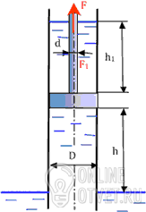 F=ρg(V1+V2)=ρ*g*π*(h2*D²+h1*D²-h1*d²)/4=1000*10*3*(2*0,1²+3*0,1²-3*0,03²)/4=355H