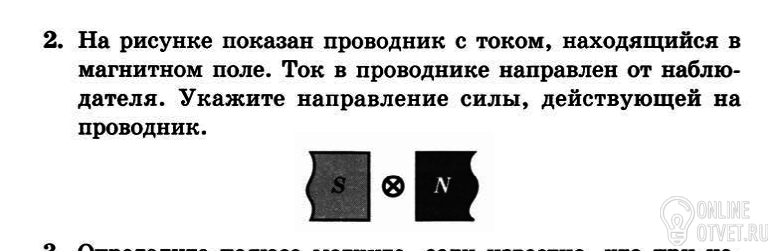 Сила направлена снизу вверх по правилу левой руки.Линии магнитного поля направлены из N в S, а ток направлен от нас (крестик).Большой палец направлен вверх.