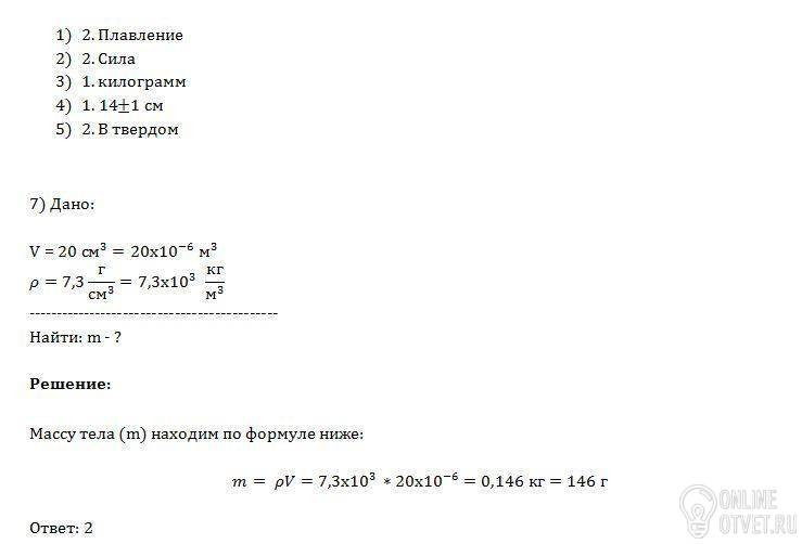 А.7. Тело объёмом 20 см³ состоит из вещества плотностью 7,3 г/см³. Какова масса тела?