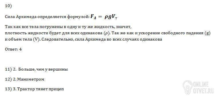 А.10. Три тела одинакового объёма полностью погружены в одну и ту же жидкость. Первое тело оловянное, второе -свинцовое, третье тело деревянное. На какое из них действует меньшая архимедова сила?
