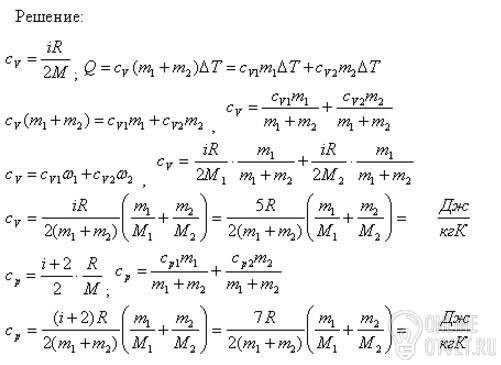 Найти молярные теплоемкости Сv и Ср смеси кислорода массой m1= 2,5 г и азота m2 = 3 г.