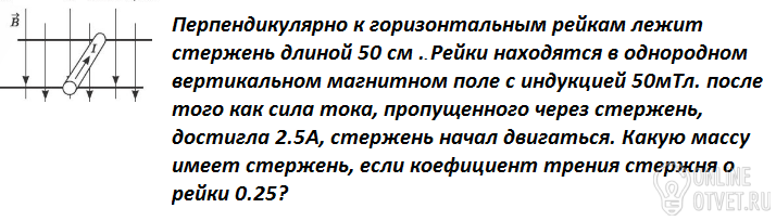 На проводник с током действует сила Ампера F=BIL, т.к. sin90=1. Когда эта сила сравнялась по величине с силой трения, проводник начал двигаться. Значит Fт=F. Так как рейки горизонтальны, то Fт=μmg. Значит μmg=BIL; m=BIL/(μg); m=50*10^-3* 2,5*0,5/2,5= 25*10^-3 кг =25 г.