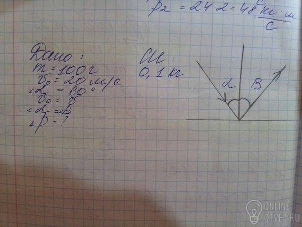возведем обе части в квадрат ⇒Δp²=p²+p²-2p²cos60=p²⇒Δp=p=mv=0,1×20=2