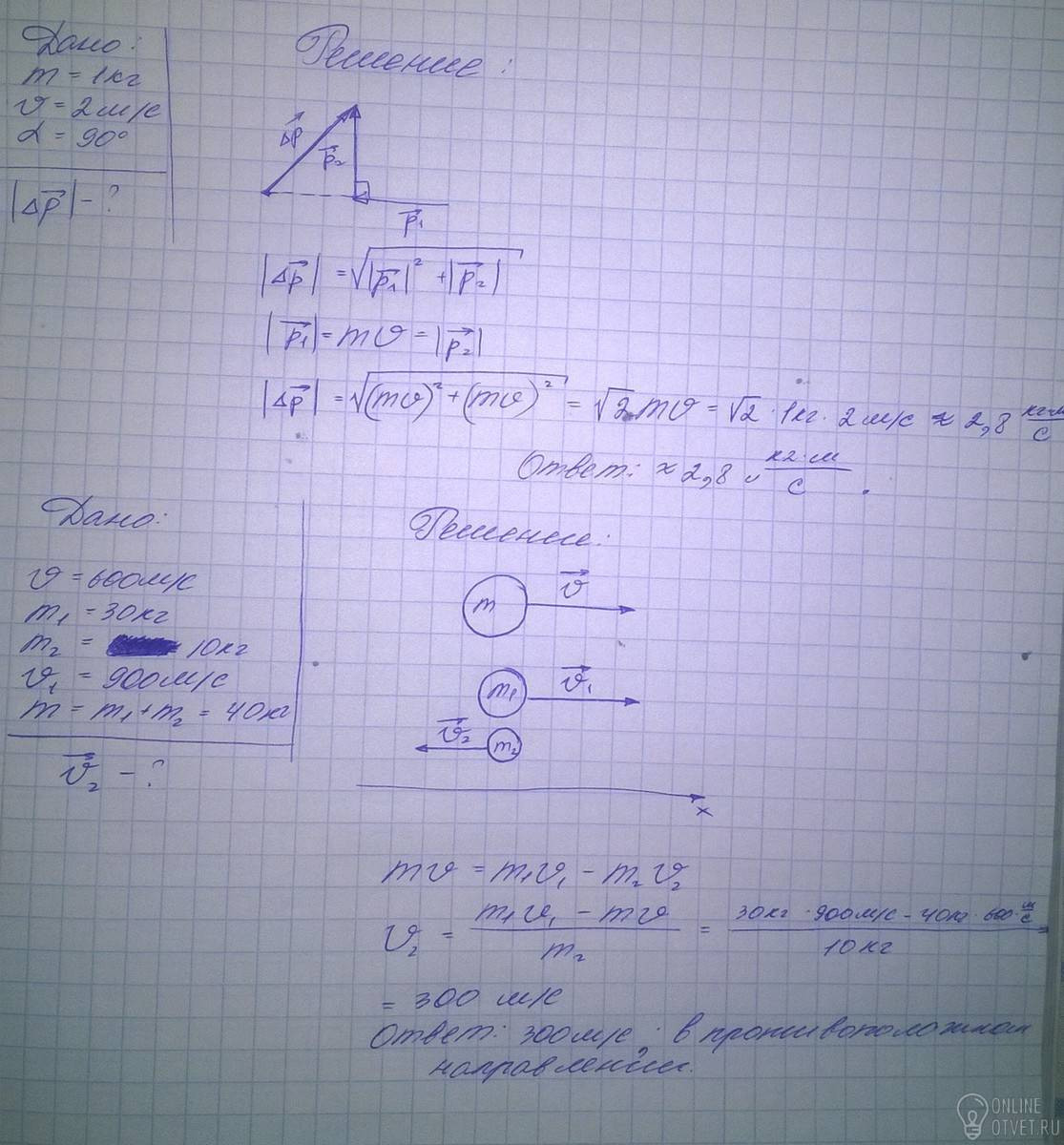 2. Снаряд, летевший в горизонтальном направлении со скоростью 600 м/с, разрывается на две части с массами 30 кг и 10 кг. Большая часть стала двигаться в прежнем направлении со скоростью 900 м/с. Какова величина и направление скорости меньшей части снаряда.?