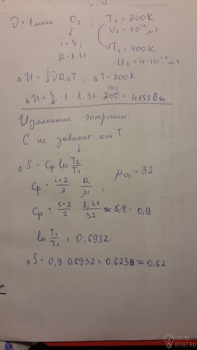 Один моль кислорода, занимающий при температуре Т1 = 200 К объем V1 = 10^–2 м3, при нагревании до температуры Т2 = 400 К расширяется до объема V2 = 4*10^-2 м3.