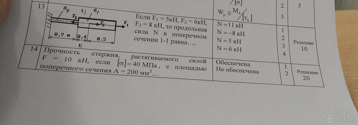 13) Поскольку на сечение I-I действуют только силы F1 = 5 H и F2 = 6 Н, то ответ: N = 5+6 = 11 кН