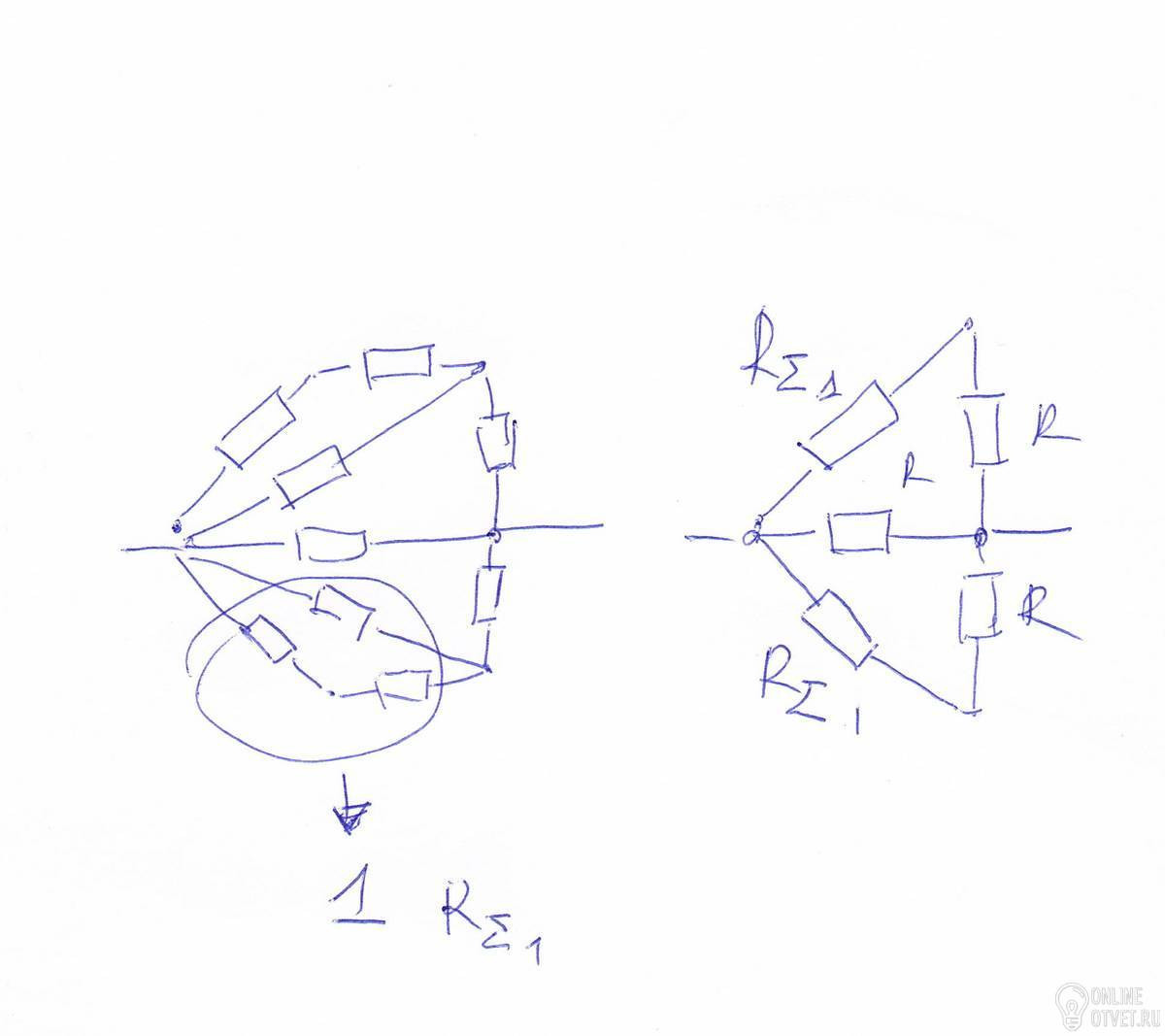 Наконец, у нас есть параллельное соединение из трех резисторов: два - по 5R/3 и один - R.