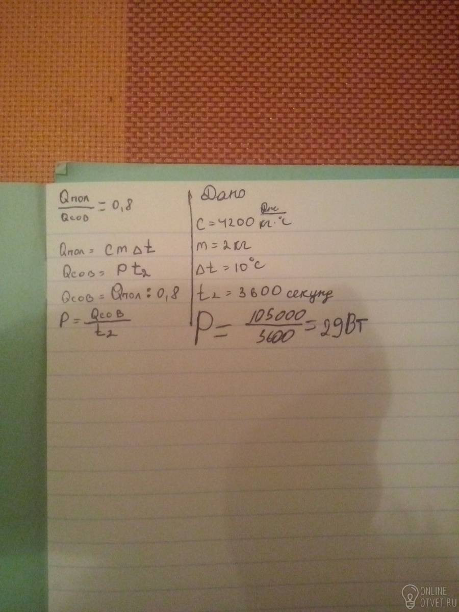 Электрический аппарат для перегонки воды имеет КПД 80%. Вода из водопровода поступает при температуре 10 градусов. За один час работы можно получить 2 л дистиллированной воды. Определите потребительскую мощность тока.