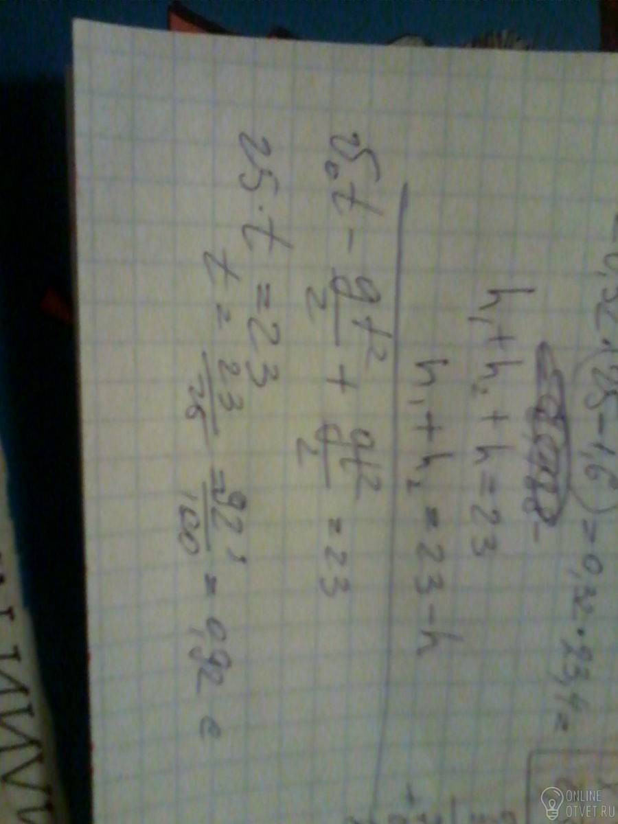 Тела А и В движутся навстречу друг другу по одной вертикали. Тело А брошено вертикально вверх с начальной скоростью (v0)1=25 м/с,тело В падает с высоты H(23м) и начальной скоростью (v0)2=0. тела начали двигаться одновременно и через время t(0.32 с) расстояние между ними стало равным h. Определить время, спустя которое тела встретятся.