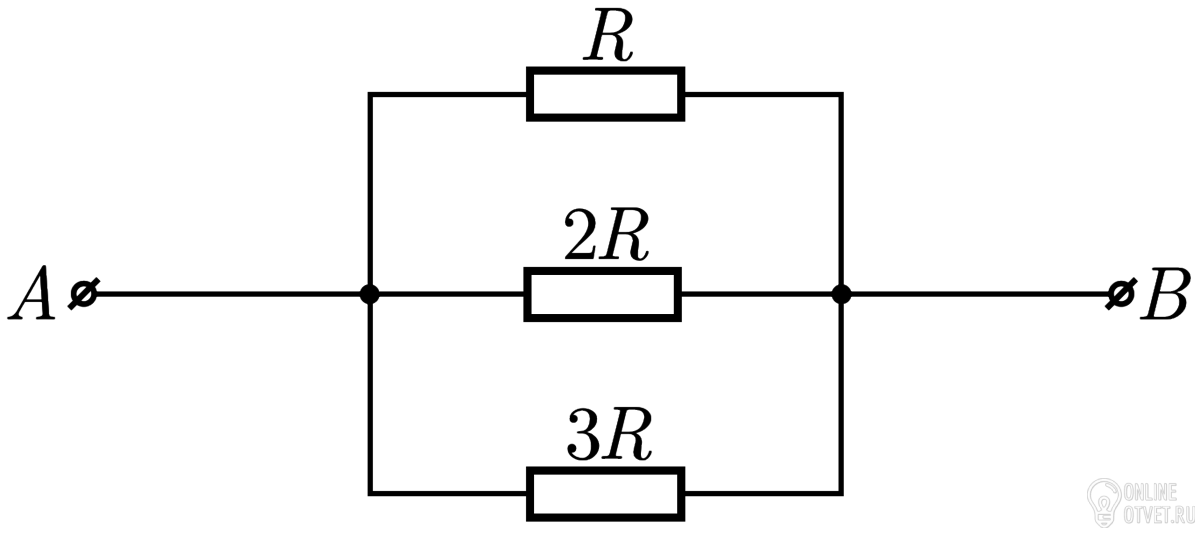 На рисунке представлена схема электрической цепи, состоящей из трёх параллельно соединённых резисторов.