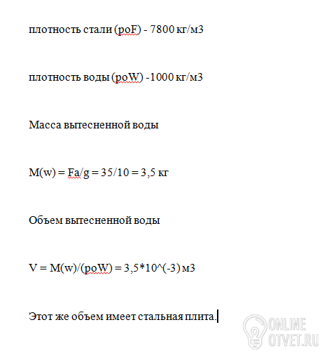Определите объём стальной плиты полностью погруженной в воду, если на нее действует архимедова сила в 35Ньютонов