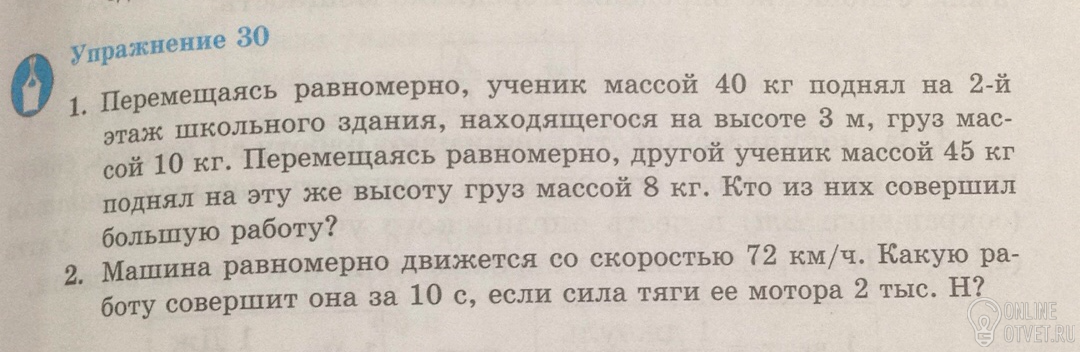 1.перемещаясь равномерно ученик массой 40 кг поднял на 2-й этаж школьного здания находящегося на высоте 3 м груз массой 10 кг перемещаясь равномерно другой ученик массой 45 кг поднял на эту же высоту груз массой 8 кг кто из них совершил большую работу
