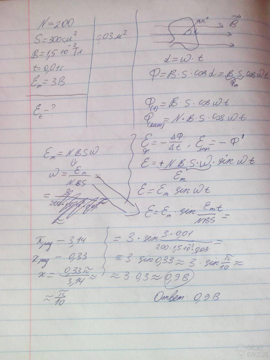 Переменный ток в рамке,имеющий 200 витков.Площадь одного витка 300 см².Индукция магнитного поля 1,5*10^-2Тл.Определите ЭДС индукции через 0,01с после начала движения рамки из нейтральногл положения.Амплитуда ЭДС равна 3В.