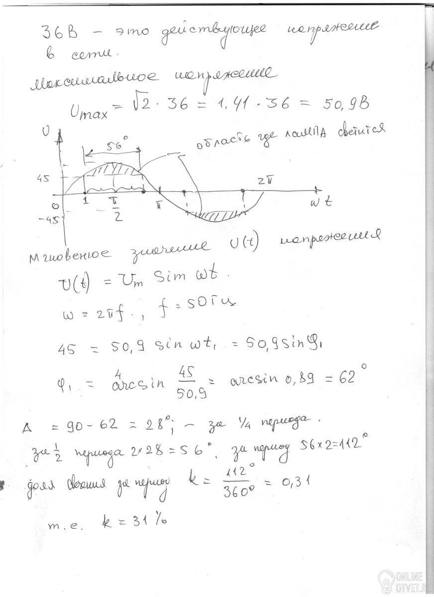 Неоновая лампа,включенная в сеть переменного напряжения 36 В зажигается и гаснет при напряжении 45 В. В течении какой доли периода лампа горит?