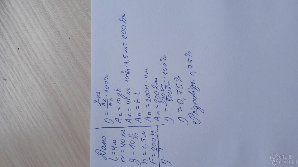 Визначте ККД похилої площини завдовжки 4 м,якщо для піднімання нею візка мосою 40 кг на висот 1.5 м потрібно прикладати силу 200 Н у напрямку руху.