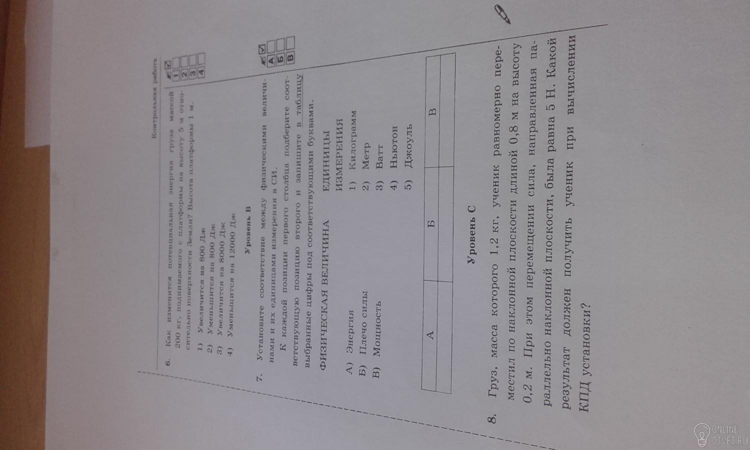 6 ответ - 3) 7 ответ - а5 б2 в3 8 n=Aп/Аз•100%;Ап=Рh;Аз=Fl;n=mgh/Fl•100%; n=(1,2кг•10Н/кг•0,2м / 5Н•0,8м)•100%=0,6•100%=60%
