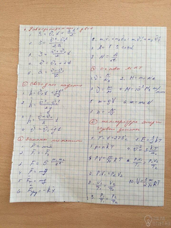 1.1,2,3-перемещение при РУД,4-скорость при РУД,5-ускорение при РУД.2.1,2,3-перемещение при свободном падении РУД,4-максимальная высота подъема.3.1-второй закон Ньютона,2-третий закон Ньютона,3-закон всемирного тяготения,4-вес тела,5-сила тяжести,6-сила упругости,6-закон сохранения импульса,7-механическая работа,8-мощность.4.1,3-количество вещества,2-молярная масса,4-молекулярная масса,6-масса одной молекулы,7-концентрация.5.1-температура по Кельвину,2-связь внутренней энергии со временем,3,4-основные уравнения Мкт,5-закон Менделеева-Клапейрона,6-закон Гей-Люссака,7-закон Бойля-Мариотта,8-изобарный закон Гей-Люссака,10-внутренняя энергия,9-закон Шарля